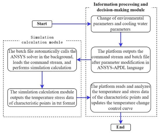 During the construction period of the aqueduct, there is real-time information interaction between the system simulation calculation module and the information processing and decision-making module. The purpose is to update the temperature variation control curve based on the changes of environmental parameters and cooling water parameters. The detailed interaction process is shown in Figure 10.