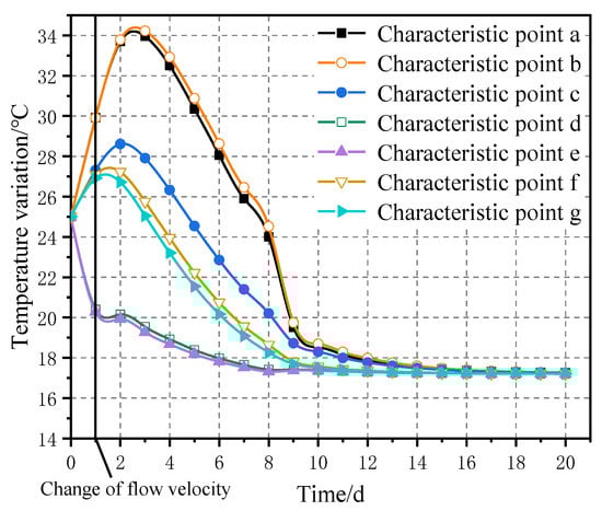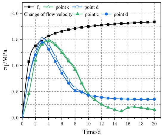 The temperature of the construction site is set to be 2 °C higher than that of previous years, and the temperature stress field of the aqueduct concrete is simulated and calculated. It can be seen from Figure 7 and Figure 8 that characteristic points c and d are the points with higher stress among all characteristic points, and the stress duration curves of characteristic points c and d are given. As shown in Figure 11, on the third day, the stress value of characteristic point d exceeds the design value of the axial tensile strength of concrete at this time. Take some adjustment measures and adjust the water flow velocity from 0.5 m/s to 0.7 m/s after the first day. At this time, the stress duration curves of characteristic points c and d are shown in Figure 11, meeting the strength requirements. The temperature change control curve of aqueduct concrete with parameter change is shown in Figure 12.