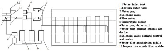 The experimental structure is shown in Figure 13. According to the “bow” path; the cooling pipes in the aqueduct are arranged, the inlet pipes are connected to the inlet tank 1.1 through flow meter 4, solenoid valve 3 and water pump 2; the return pipes are connected to the return tank 1.2 through flow meter 4 and the water tanks 1.1 and 1.2 are connected through pipes. One temperature sensor and one flowmeter are, respectively, arranged at the water inlet and the return outlet, three temperature sensors at equal intervals next to the cooling pipe of the aqueduct.