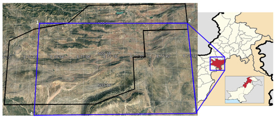 Location of the study area in the Kohat–Karak districts of the Khyber Pakhtunkhwa province of Pakistan (blue), the extent defined by corner points (1) 33 30′9.83″ N, 70 45′2.05″ E; (2) 33 30′9.83″ N, 71 54′14.87″ E; (3) 32 55′37.63″ N, 71 54′14.87″ E; and (4) 32 55′37.63″ N, 70 45′2.05″ E. The extent of a published geological map of the area (Figure S1 [38]) is in black.