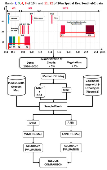 Additionally, vegetation and soil cover further make it difficult to map the deposits [24]. The Sentinel-2 satellite with the MSI on board [55] has a high revisit frequency, and mission coverage provides local, regional, national, and international data. In addition, due to the relatively higher spatial resolution SWIR bands, Sentinel-2 is generally more suitable for mineral exploration and lithological mapping [2]. However, robust ML algorithms must be required to deal with limited data (without TIR bands) for identifying various rock types.