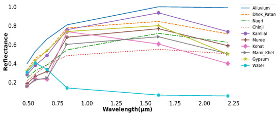 The reflectance values of all the training samples of Sentinel-2 data sampled from GEE for each class are shown in Figure 4. The plot shows the normalized value, dividing the samples’ reflectance values with peak reflectance values. The highest peak value of 1 is shown by alluvium at 1.61 µm, while water shows the high absorption/smallest reflectance value of 0.05 at 2.2 µm, as compared with other classes. The normalized reflectance value of each class increased from 0.50–0.83 µm; all formations have a positive gradient (slope) from 0.83–1.61 µm, except negative gradient of water in that range. The Kohat Formation also slightly declines the reflectance value from 0.56–0.66 µm. There is a sharp decline in the reflectance value of the Jatta Gypsum Formation after 1.61 µm. The overall average reflectance value of Kamlial Sandstone, Dhok Patan, alluvium, and Jatta Gypsum was higher than the Nagri, Kohat, Muree, Mami Khel, and Chinji formations. These reflectance values could not distinguish between the lithologies of interest and therefore invited the use of machine learning algorithms for better delineation and further analysis.