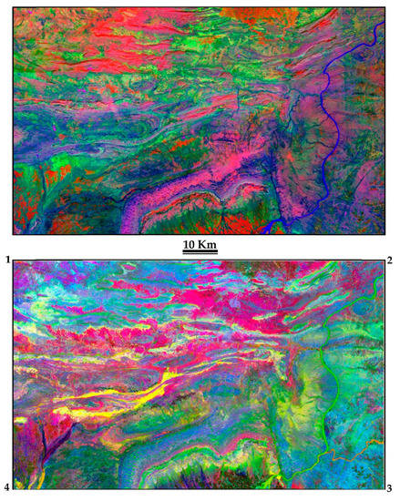 MNF (top) and false-color composite (bottom) of PC components (PC-3, PC-4, and PC-5) of the study area defined by corner points (1) 33 30′9.83″ N, 70 45′2.05″ E; (2) 33 30′9.83″ N, 71 54′14.87″ E; (3) 32 55′37.63″ N, 71 54′14.87″ E; and (4) 32 55′37.63″ N, 70 45′2.05″ E.