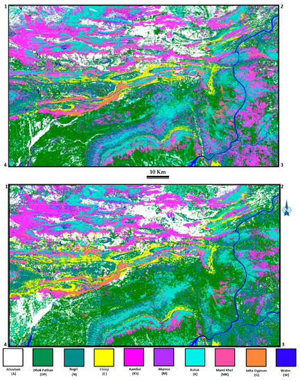 Final classified map using ANN (top) and SVM (bottom) bounded by the point corners (1) 33 30′9.83″ N, 70 45′2.05″ E; (2) 33 30′9.83″ N, 71 54′14.87″ E; (3) 32 55′37.63″ N, 71 54′14.87″ E; and (4) 32 55′37.63″ N, 70 45′2.05″ E.