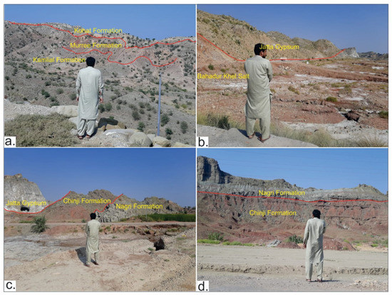 Field photographs of the lithostratigraphic units in the mapped area. (a)—Looking north at contacts among the Kohat, Murree, and Kamlial formations. (b)—Showing evaporites (Jatta Gypsum and Bahadurkheil Salt). (c)—Looking northeast at contacts among the Jatta Gypsum, Chinji, and Nargi formations. (d)—Looking north at the contact between the Chinji and Nagri formations (man’s height = 6 feet).