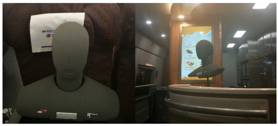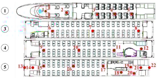 The noise measurement was carried out on a high-speed train (CR400BF) in China to collect noise samples. The train consisted of eight carriages. The carpet was laid on the floor; the seat covers were removed; and the doors remained closed. There were no passengers on the train. The train was running on a concrete track in an open field with a constant speed of 350 km/h. Twenty-two measuring points were arranged with reference to ISO 3381-2021 [22] in carriages 1, 3, 4, and 5. Areas with or without passenger seats were both considered. The noise in the driver’s cab was also recorded. The measuring points on the train are presented in Figure 2.