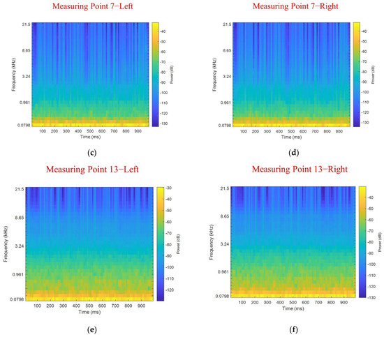 Mel spectrogram: (a) Measuring point 1 Left; (b) Measuring point 1 Right; (c) Measuring point 7 Left; (d) Measuring point 7 Right; (e) Measuring point 13 Left; (f) Measuring point 13 Right.