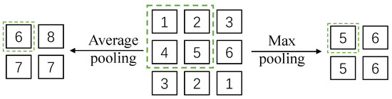 The operations of the max pooling and average pooling layer are shown in Figure 8. The filter size is 2 × 2. The pooling layer reduces the spatial size of the data, the number of parameters, and the amount of computation in the CNN.