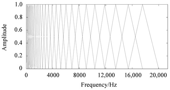 Each filter in the filter banks is a triangular filter. It has a response of 1 at the center frequency and decreases linearly to 0 when it reaches the center frequencies of the two adjacent filters. The filter banks in this paper’s sound quality model contain 26 filter banks. It starts at 0 Hz and ends at 20,000 Hz, as shown in Figure 9.