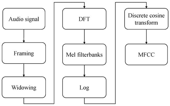 The filter bank coefficients are obtained after applying filter banks to the power spectrum of the sound signal. Then, take the log of each of the 26 coefficients. The discrete cosine transform (DCT) is applied to decorrelate the 26 log coefficients and to give 26 Mel frequency cepstral coefficients. Figure 10 shows the steps involved in MFCC feature extraction.