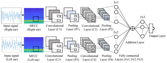 The proposed binaural MFCC-CNN sound quality model was built on MATLAB to study the relationship between the subjective evaluation and HST interior noise. The architecture is displayed in Figure 11. The MFCC of the sound signal was used as input to the model.