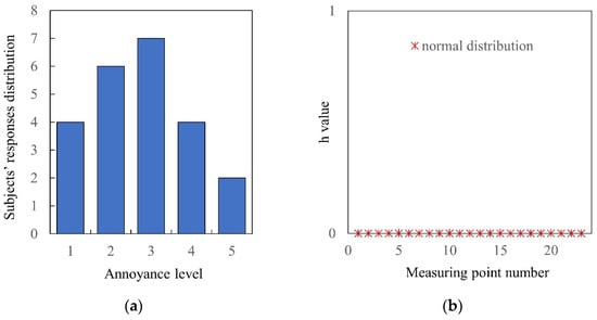 Generally, subjects’ evaluation of the same sample follows the law of normal distribution. The Lilliefors test was conducted to check whether the response data belong to the family of normal distributions. Figure 13a shows the subjects’ responses’ distribution of noise of measuring point 11. The Lilliefors test of each measuring point was conducted in MATLAB 2020a, and the results were shown in Figure 13b. The returned value of h = 0 indicates that the Lilliefors test does not reject the null hypothesis at the 1% significance level, so the subjective results of all the measuring points followed the law of normal distribution.