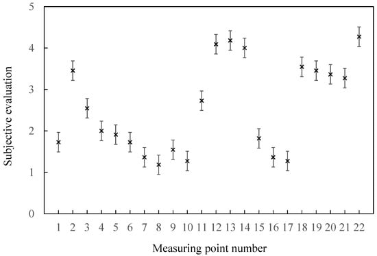 From the subjective test results in Figure 14, the evaluated noise samples were categorized into four scales. If the mean value was smaller than 1.5, the measuring points were labeled as ‘Not at all’. For measuring points with a mean value between 1.5 and 2.5, they were rated as ‘Slightly’. Then, the points with a mean value between 2.5 and 3.5 were rated as ‘Moderately’. The points were rated as ‘Very’ if the mean value was between 3.5 and 4.5. Because the highest mean value was 4.27 at point 22, no points were rated as ‘Extremely’.