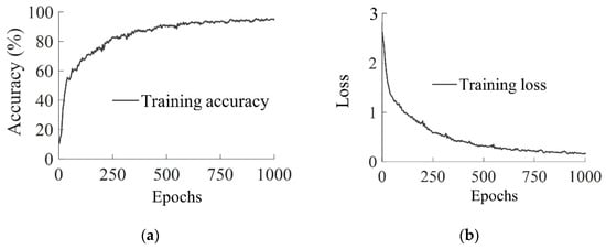 Training progress of the binaural MFCC-CNN model: (a) Training accuracy; (b) Training loss.