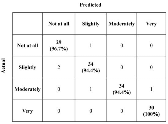 The binaural MFCC-CNN model made an accurate assessment. It predicted ‘Not at all’ 31 times, ‘Slightly’ 36 times, ‘Moderately’ 34 times, and ‘Very’ 31 times. The model made 127 accurate evaluations and missed 5, so the testing accuracy was 127/132 (96.2%). One ‘Not at all’ was wrongly evaluated as ‘Slightly’, and two ‘Slightly’ were wrongly evaluated as ‘Not at all’. To improve the accuracy, it is important to increase the number of samples of ‘Not at all’ and ‘Slightly’ to train the model better.