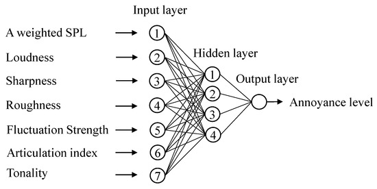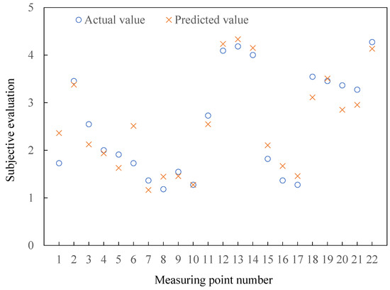 To compare the performance of the binaural MFCC-CNN model, a shallow neural network sound quality model was built and is shown in Figure 17. Seven commonly used parameters (A-W SPL, loudness, sharpness, roughness, fluctuation strength, articulation index, tonality) were applied as inputs of the model; the output was annoyance level. The input layer, hidden layer, and output layer contain seven nodes, four nodes, and one node, respectively. The number of noise samples in the shallow neural network model is the same as that in the binaural MFCC-CNN sound quality model. The same subjective results were used to compare the performance of this shallow neural network model and the binaural MFCC-CNN model. Figure 18 presents the evaluation result of the shallow neural network model. Although the predicted value of each measuring point is very close to the actual value, the model accuracy (91.1%) is lower than the binaural MFCC-CNN model. One possible reason is that the input parameters in the shallow model do not consider the influence of the time-varying characteristics of the sound samples, so the binaural MFCC-CNN model performs better in the evaluation of sound quality.