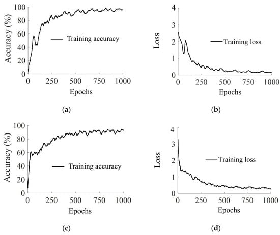 The training progress of different sound quality models: (a) Training accuracy and (b) Training loss of the monaural MFCC-CNN model; (c) Training accuracy and (d) Training loss of the binaural time series CNN model.