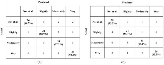 To investigate the prediction distribution further, the confusion matrix of testing accuracy of each model is shown in Figure 21. In Figure 21a, the highest accuracy (97.2%) appears at ‘Moderately’, while the lowest accuracy (86.7%) appears at ‘Not at all’. Compared with the binaural MFCC-CNN model, the monaural MFCC-CNN model is less accurate in the assessment of ‘Not at all’ and ‘Slightly’. Two ‘Not at all’ responses are wrongly evaluated as ‘Moderately’, and three ‘Slightly’ responses are wrongly evaluated as ‘Moderately’. It appears that the monaural model is more willing to evaluate the sample as ‘Moderately’. Perhaps the time and the level difference between the two ears are crucial factors affecting the subjective evaluation at a low annoyance level. However, the monaural MFCC-CNN model could not take such differences into account, which causes lower accuracy. As can be seen from Figure 21b, the binaural time series CNN model has the highest accuracy (93.3%) in ‘Not at all’ and the lowest accuracy (83.3%) in ‘Very’. The accuracy decreases with the increase in annoyance level.