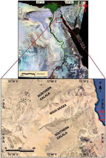The central part of the Gulf of Suez area has a long history of tectonic events. The Wadi Araba basin is located in the central part of the Gulf of Suez zone (Figure 1). It has a length of about 80 km and a width of about 30 km, oriented in the NE–SW direction. Along the Wadi Araba basin, there is a major river running through the whole length that is fed by valleys from the Northern and Southern Galala Plateaus. The Northern Galala Plateau is bounded by steep cliffs to the north, east, and south, whereas the Southern Galala Plateau is edged by steep cliffs to the north and east. The highest point of the Northern Galala Plateau is recorded as 1249 m and the altitude decreases westward to reach 400–500 m at the El-Maaaza Plateau. The highest point of the Southern Galala Plateau is 1349 m. This plateau is more dissected than the northern plateau.