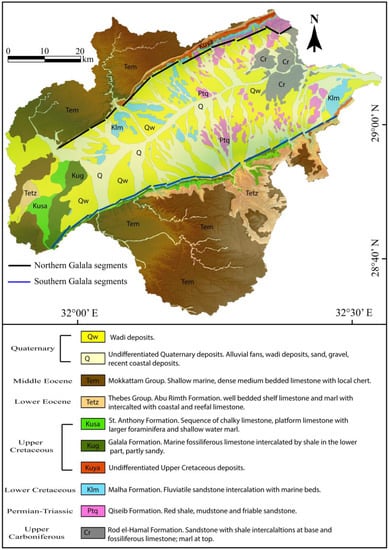 The rock units recorded in the study area include marine and non-marine successions varying in age from Paleozoic to Quaternary. The whole succession is underlain by Precambrian basement rocks. Regarding the Oligo-Miocene event of the Suez rifting, the lithology of the study basin is classified into three major tectonostratigraphic events: the pre-, syn-, and post-rift []. Different rock types were recorded in the study basin, including rocks from the Upper Carboniferous Rod El-Hamal Formation. This formation is composed of limestone, shale, and thin layers of sandstone []. Rocks from the Permian–Triassic period were recorded in the Qisieb Formation. It has a thickness of about 44 m in the Northern Galala Plateau and consists of interbedded ferruginous, continental, red beds of sandstone and variegated shale []. The overlaying Lower Cretaceous Malha Formation consists mainly of white to grey cross-bedded continental sandstone, passing into marine beds [] (Figure 2). The Upper Cretaceous is represented, from older to younger, by undifferentiated deposits in the Galala Formation and St. Antony Formation, respectively. The Galala Formation is located mainly at the western flank of the study basin and represented by marine limestone with shale (Figure 2). The St. Antony Formation consists of chalky limestone and shallow-water marl []. The Lower and Middle Eocene are represented by the Abu Rimth Formation and Mokkattam Group, respectively [] (Figure 2). The youngest Quaternary units in the study area are represented by the Quaternary and Wadi deposits [] (Figure 2). The Upper Cretaceous, Quaternary, and Wadi deposits cover the majority of the study area (Figure 2).