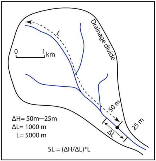 where (dH/dL) indicates the local slope of the channel segment being investigated, and L is the channel distance from where the channel midpoint of the river reach divides, for which this index is extracted [,] (Figure 3). The SL index provides higher values when streams flow over harder materials or actively uplifting regions, and the values are lower over softer rocks or slowly uplifting regions [,].