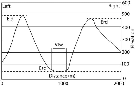 where Vfw is the width of the examined valley; Eld and Erd indicate the two elevations of the left and right valley wall, respectively; and Esc is the elevation of the valley floor (Figure 5). Generally, high Vf values indicate flat-floored valleys associated with a low rapid uplift and valley incision rates, whereas low values of Vf indicate V-shaped valleys.
