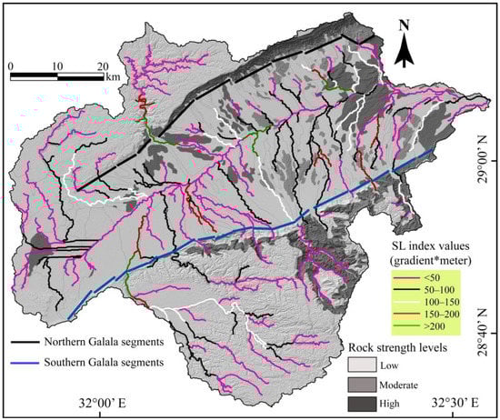 This work began with examining and evaluating the strength of the rocks over the entire Wadi Araba basin. The rock strength was defined according to the field observations from previous similar works [,,]. We define rock strength according to the author of Ref. []. This author categorizes the rock hardness according to the constituent and cement material that aids in the resistance against weathering processes and fluvial erosion. However, in this study, we define the classes of rock strength as a) the low strength class (e.g., alluvium, limestone, marl, conglomerates, and sandstones), the moderate strength class (e.g., shale and sandy limestone), and finally the high strength class (e.g., basalt, marble, quartz, gabbro, and gneiss).