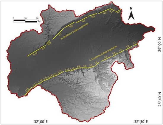 Modern and advanced techniques, including remote sensing and GIS on high resolution data, are excellent tools to apply to high-resolution data for structural and lithological mapping [,,] and for assessing natural geological hazards [,,,,]. In this paper, the technique of analysis required many steps. The geological map sheet was rectified and prepared as a layer underneath the topographic layer by using ArcGIS. The geological units of the study area were extracted and mapped. Based on the rock strength index results, one layer of the level of rock resistance is added. An SRTM digital elevation model was prepared and corrected by using hydrology tools in spatial tools in the Arc toolbox. A Hill-shade map was modeled and visualized to calculate the Smf index values. The northern flank of the Wadi Araba was segmented into 10 segments, while the southern edge was classified into 18 segments. The flow direction, flow accumulation, and stream extraction were applied with the hydrology tool to produce maps of the streams and drainage systems. The extracted maps were used to calculate the rest of the indices including SL, Vf, and H. The morpho-tectonic indexes are described in the following subsections.