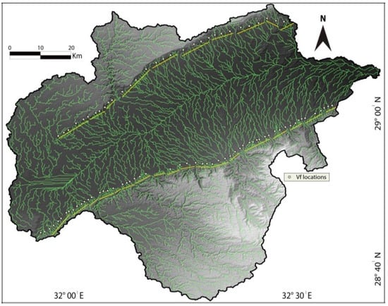 Location of the Vf index along the stream crossing Northern and Southern Galala Plateaus.