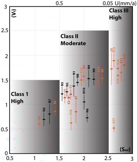 In order to discuss the various tectonic activity signals of the Wadi Araba basin, we examined and analyzed the results of all calculated morpho-tectonic indices. The results of the Smf and Vf indices show a well-correlated relationship for all mountain front segments, with the exception of segments N6, N10, S7, S17, and S18 (Figure 9). These segments have similar Smf values regarding the other segments, but they indicate a very high Vf index value. These inconsistent values indicate anomalies in the signals that give rise to very high mean values with relatively low Smf values. This case was recorded by the author of Ref. []. Therefore, we agree with his conclusion, which states that the Smf index values are more significant than the mean Vf values in terms of recognizing the activity of the front segments.