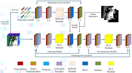 Figure 1 shows the basic EACNN framework, including its endmember network (EN) and unmixing network (UN). First, through an effective clustering method, the required pseudo-pure endmember bundles are obtained by aggregating the HSI feature information. Next, the EN maps the pseudo-pure endmember bundles to the network layer, which obtains the global spatial and spectral information in the HSI through an efficient convolutional block attention module (ECBAM). The UN obtains the spectral information in the HSI that is useful for learning via effective channel attention (ECA) []. Finally, the EACNN uses a parameter-sharing strategy to make the two networks communicate closely, allowing the EN to embed the inherent physical properties of the endmembers into the UN, the UN to feed back its information to guide the EN, and the two sides to promote each other in such a manner as to make the whole network learn in a more accurate and reliable way.