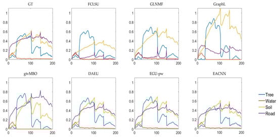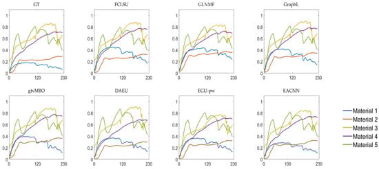 Table 4 shows the estimates of abundance and endmembers for the Jasper Ridge dataset, and Figure 5 shows the abundance map for this dataset. Figure 6 shows the endmember extraction results. The FCLSU and gtvMBO strictly adhered to the ASC constraints, resulting in poor estimation in terms of the endmembers and abundances. While it retained the details, the GLNMF did not capture the global feature information well, presumably due to the complexity of the ground feature distribution. It can be seen from Figure 5 that GraphL and gtvMBO performed well at distinguishing narrow roads due to their use of a graph structure and that non-local similarity played an important role in the narrow pixel information provided in the abundance map. However, it can be seen that there was a lot of noise in the abundances obtained by GraphL. In addition, the DAEU performed well. EGU-pw, which has a two-stream architecture, achieved excellent results by refactoring the HSI. Compared with the former, the EACNN pays more attention to the capture of feature information and network guidance, and thus, achieved excellent Mean SAD and RMSE values.