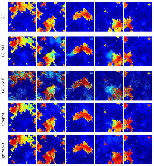 Although the FCLSU algorithm performs unmixing well, its final solution tends toward a local optimum solution, which is unfavorable for HSIs containing large amounts of data. The GLNMF approach hinges on converting a non-negative matrix with higher dimensions into two non-negative matrices with lower dimensions. However, when it is directly applied to the estimation of abundance, it often falls into the local minimum problem. The GraphL and gtvMBO methods improve the efficiency using the Laplacian graph operation, but their optimizations are aimed at the endmembers only, with no consideration of the abundance.