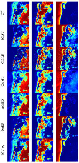 In previous work, researchers proposed many unmixing algorithms, such as fully constrained least-squares unmixing (FCLSU) [], graph-regularized l1/2-NMF (GLNMF) [], unmixing based on the graph Laplacian (GraphL) [], the Merriman–Bence–Osher (MBO) scheme for solving a graph’s total variation subproblem (gtvMBO) [], deep autoencoder unmixing (DAEU) [] and the endmember-guided unmixing network with pixelwise (EGU-pw) []. Their advantages and disadvantages are shown in Table 1.