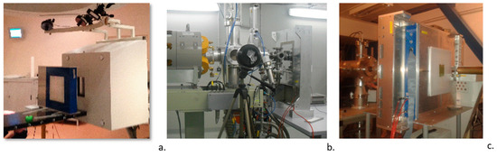 Pictures of the experimental setup for the MGD tests at the end of the Beam Transport Line in the three research rooms, (a) CNAO, (b) Bern University Hospital, (c) CATANA.