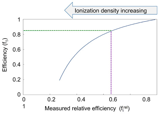 In order to determine the calibration curve, measurements with the MGD need to be performed by varying beam intensities and detector bias voltages to change the rate of recombination. The corresponding collection efficiencies can either be determined using a reference detector (e.g., a Faraday cup) or, as in the present study, using the analytical models described in the previous section to fit the data, as explained in the following.