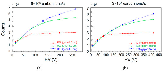 Integral counts measured by the three chambers as a function of the bias voltage for two beam intensities: (a) 6 × 106 and (b) 3 × 107 carbon ions/s.