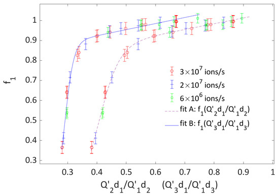 In Figure 9, we report the relevant curves, which can be used to extract the corrected integral counts of IC1. The IC1 efficiencies (f1), computed as the ratio between the actual IC1 readouts and the Csat, are plotted as a function of fn/f1 = d1/dn where n = 2 and n = 3. Data are then fitted with Equation (6), providing two calibration curves (fit A and B in Figure 9), each one being specific of the beam and detector characteristics used. The fit parameters are summarized in Table 2.