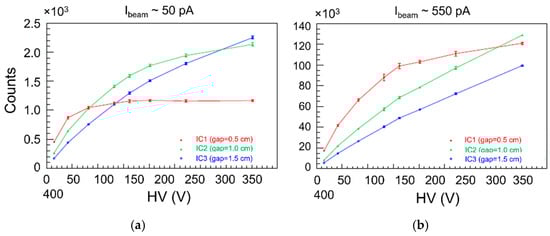 Integral counts measured by the three chambers as a function of the bias voltage for two beam intensities: (a) 50 pA and (b) 550 pA.