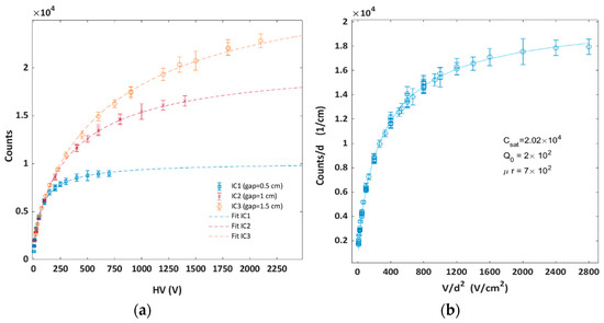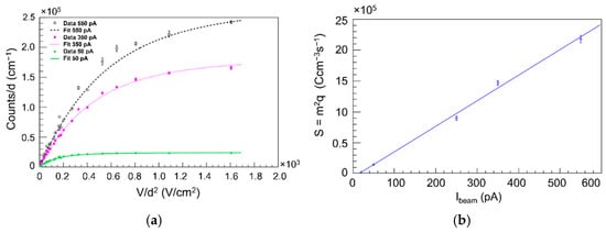 The counts per unit of thickness as a function of V/d2 are shown in Figure 8a and depend on the beam intensity. The measurements from different chambers reach the saturation at around 600 V/cm2 for 50 pA, while more than 1600 V/cm2 would be needed for 350 pA and 550 pA. The integrated charge for each test increases with the beam intensities because the MGD was irradiated for a fixed time. Using Equation (5) for fit and Equation (1) for f, the fits to the points were calculated and shown in the same figure. The rate of volumetric ionization (S) as a function of the measured beam current is evaluated from fits, and the good linearity is shown in Figure 8b.