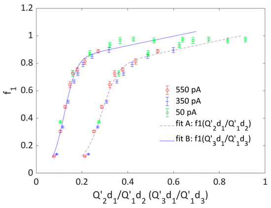 Inserting these values in Equation (6) and using the parameters as from the fits, we extract f1 = 0.9466 from fit A and f1 = 0.9428 from fit B. The total deviation between the two corrected IC1 readouts is less than 0.5%.