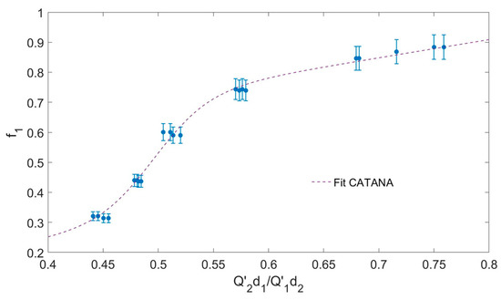 Figure 10b shows the counts per unit of thickness as a function of V/d2. The fit shown in the figure was calculated using Equation (5) and the Boag’s function for pulsed beam (Equation (2)) to compute the efficiency f. The large charge recombination observed in chamber 3 with the CATANA pulsed beam lead to a few good points to reconstruct the calibration curve; therefore, f1 was evaluated using data from IC1 and IC2 only, as shown in Figure 11. The fit to the data with Equation (6) is overlapped to the points in Figure 11, and the parameters are listed in Table 2.