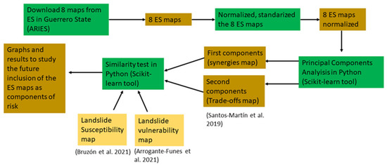 For the integration of these ecosystem services, an alternative methodology to the one typically used in risk studies is proposed here. First, we identified the main ES that could be related to the landslide risk, and we evaluated the ES in Guerrero State in Mexico. Then, we applied a principal component analysis (PCA) using the raster layers of each ES map individually. Our methodology introduces all the raster ES maps normalised into a principal component analysis (PCA) to comprehensively assess the territory’s synergies and trade-offs [43]. Finally, we applied analysis of similarities using the first (synergies) and second (trade-offs) PCA components and the maps from susceptibility and vulnerability achieved in Arrogante-Funes et al. [28].