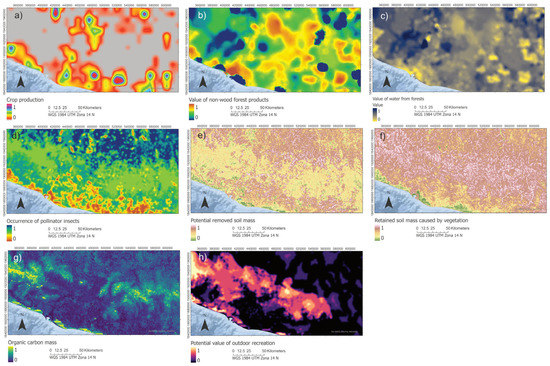 ES maps from Guerrero State in México: (a) crop production; (b) value of non-wood forest products; (c) value of water from forests; (d) occurrence of pollinator insects; (e) potential removed soil mass; (f) retained soil mass caused by vegetation; (g) organic carbon mass; (h) potential value of outdoor recreation.