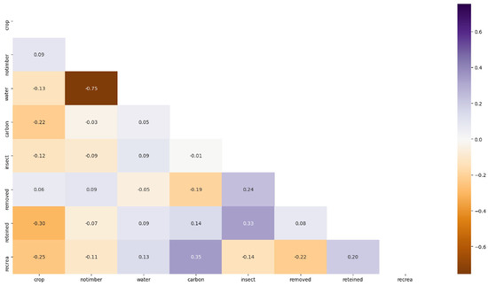 Correlation graph between pair of ES values in The State of Guerrero in México. The “crop” means crop production, “notimber” is the value of non-wood forest products, “water” means the value of water from the forest, “carbon” is organic carbon mass, “insects” refers to the occurrence of pollinator insects, “removed” is potential removed soil mass, “retained” is retained soil mass caused by vegetation, and “recrea” means potential value of outdoor recreation.