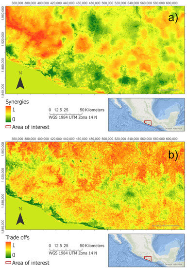 Figure 4b shows the areas of greatest trade-offs of ecosystem services in the north and northeast of the study area. These trade-offs imply that the increase in one of the services causes the detriment of another. On the other hand, it is observed that the regions with lower trade-off values are those related to the coast.