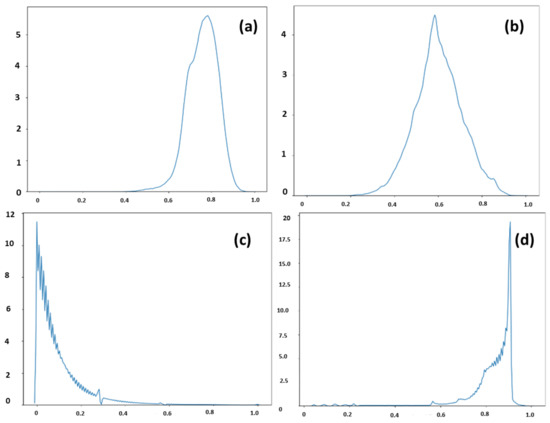 We applied a min–max scaler algorithm to perform the graphical analysis of the distributions. This algorithm lets us transform the data by scaling each variable to a linear pre-established range, and it is performed to allow the best interpretation of the distributions since negative values are eliminated by introducing an acceptable minimum of 0 and a maximum of 1, unlike with the z score normalisation method, which goes from −1 to 1 [49].