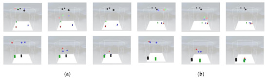In the simulation environment, in order to facilitate the analysis of the problem, the UAV and the obstacles in the air area are set to the shape of a sphere, the radius of the UAV is , and the radius of obstacles is . The landmark is set as a cube in order to distinguish it from the UAV, and then one of the landmarks is set as the target. The radius of its effective range is . When the UAV approaches the target area, for example , it is determined that the UAV reaches the target area. At this time, the position of the UAV is , and its speed is .