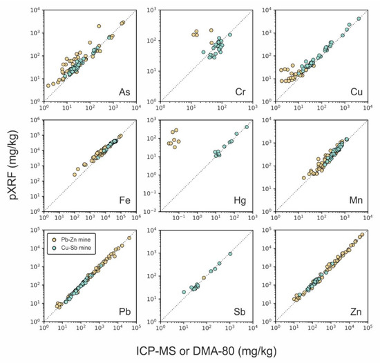 - Mercury (Hg) and antimony (Sb): these trace elements were found quantitatively determined by pXRF only when occurring with concentrations > 10–20 mg/kg. Conversely, when the real sample concentrations were below such values, as in the case of Hg, pXRF produced false-positive results, which should be manually removed by the user via spectral interpretation. Unfortunately, this result reveals a serious limitation in using pXRF, as the operator may be precluded from detecting low concentrations of Hg in soils that exceed those threshold levels specified by national regulations that define the use of uncontaminated soil. This is the case with the Italian legislation, for instance, where the highest threshold level, defined by major land use, i.e., for commercial and industrial purposes, is fixed at 5 mg kg−1, whereas for public, private, and residential use, it is 1 mg kg−1 (Italian Legislative Decree 152/06 [9]).