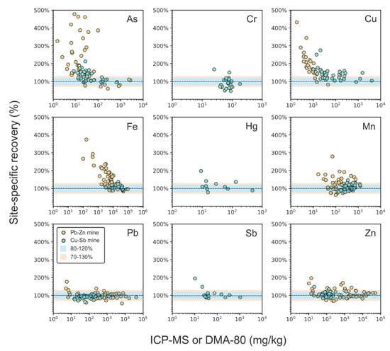 - Chromium (Cr): the metal showed moderate comparability between the two analytical approaches in the Cu-Sb matrix, characterised by relatively higher Cr concentrations and occurrence of false positives by using pXRF in the carbonate-hosted Pb-Zn samples that should be removed by the user via manual spectral interpretation. Overall, Cr never exceeded the “qualitative” level when determined via pXRF;